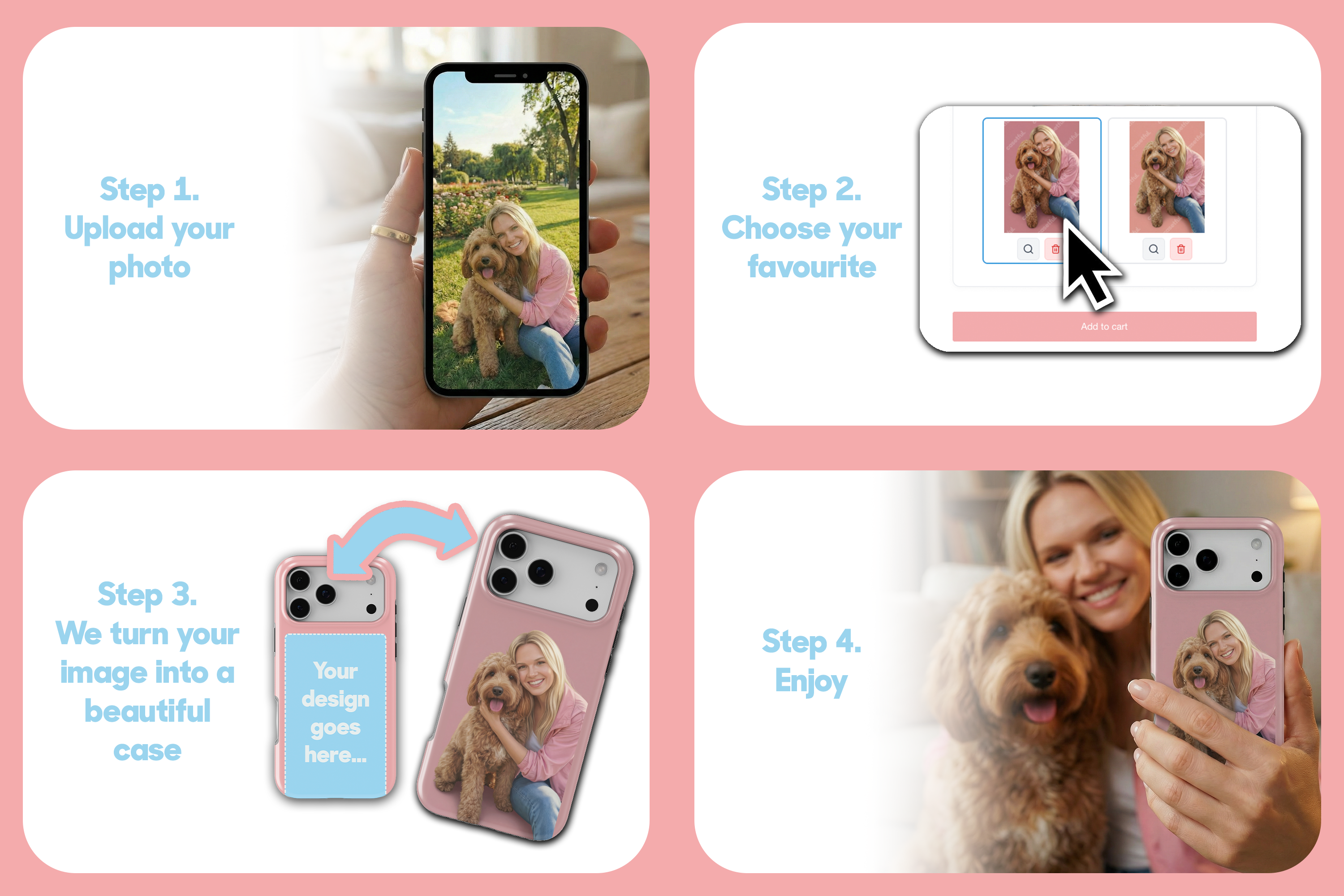 - You select the phone model, case type and image option you want and place your order.